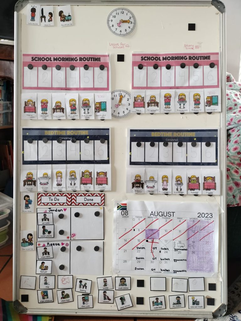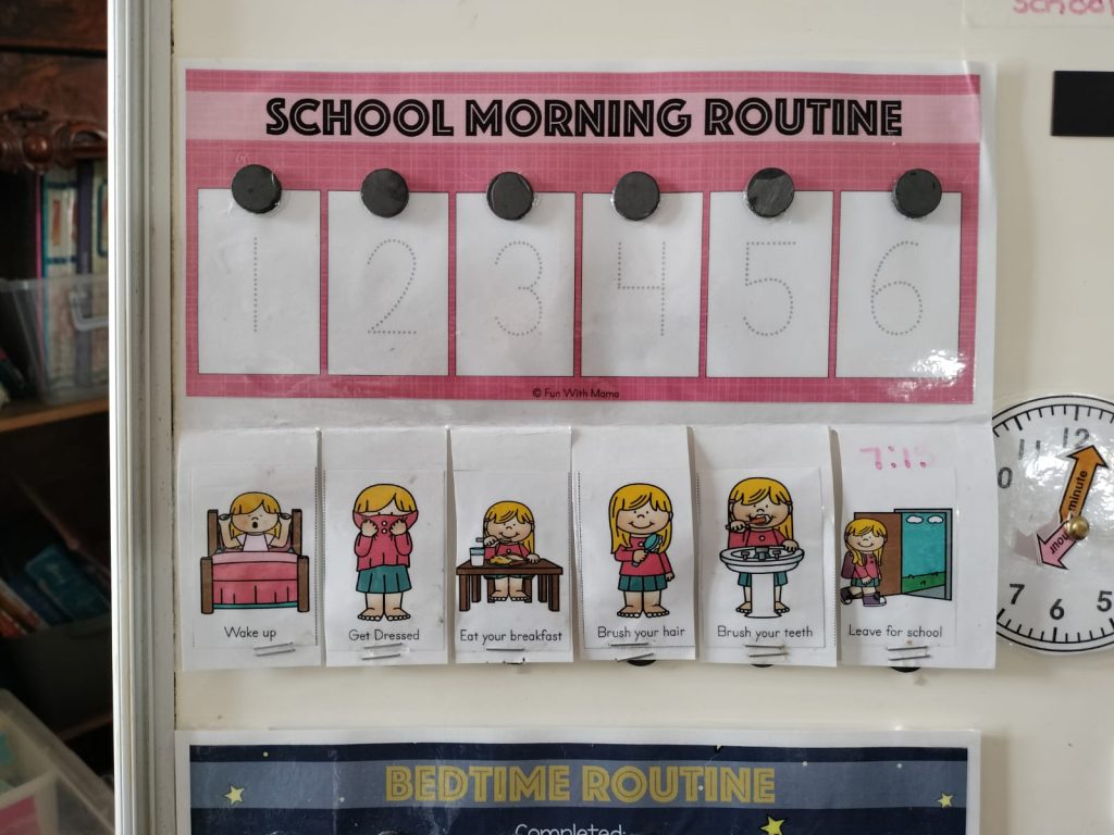 Practical tip: a routine chart that engages the child motivates them to refer to it. E.g. flip windows that close
