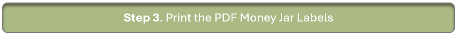 Print the pdf money jar labels and purchase 3 jars per child if you are implementing the GIVE / SPEND / SAVE method in your home. Preferably use a jar that can be viewed into without opening. (I found three plastic containers that increased in size)